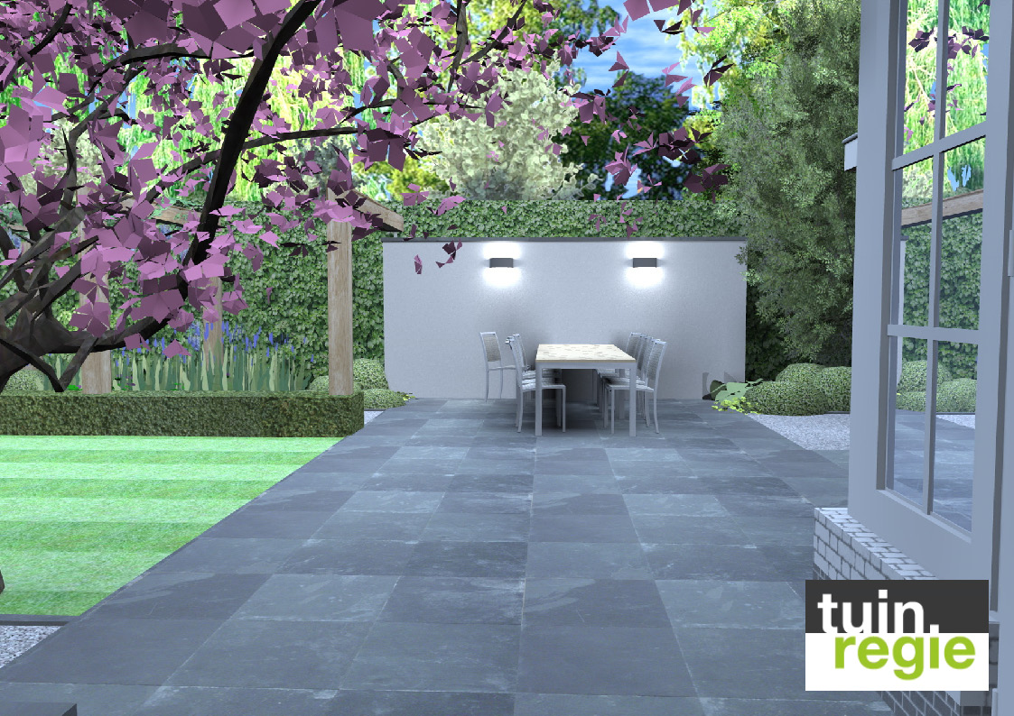 Deze landelijke tuin is op een subtiele manier in het centrale deel opengelaten, om het zicht te versterken. De zijkanten zijn met een luxe overdekt terras en een begeleidende loofgang versterkt.